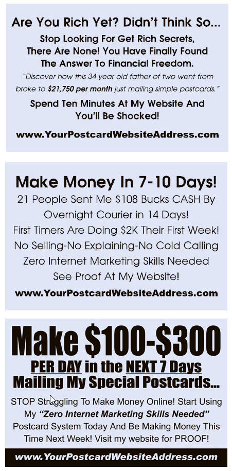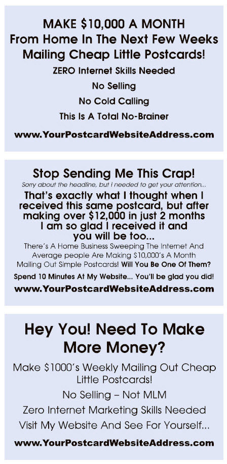 Postcards are 4 x 6 inches and Sizzle Cards are standard business card size.