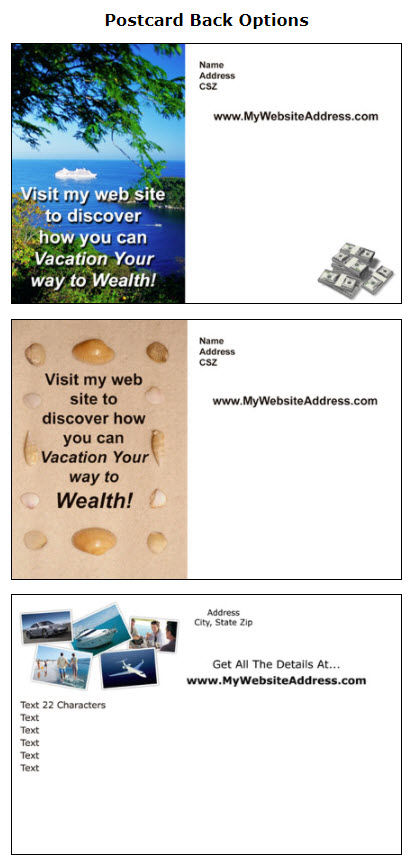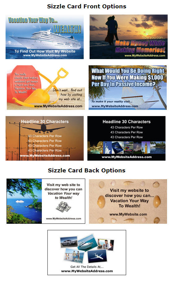 Postcards are 4 x 6 inches and Sizzle Cards are standard business card size.