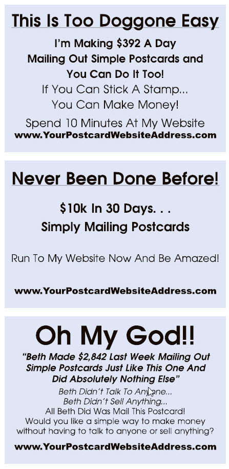 Postcards are 4 x 6 inches and Sizzle Cards are standard business card size.