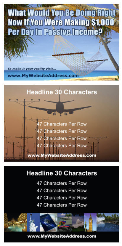 Postcards are 4 x 6 inches and Sizzle Cards are standard business card size.